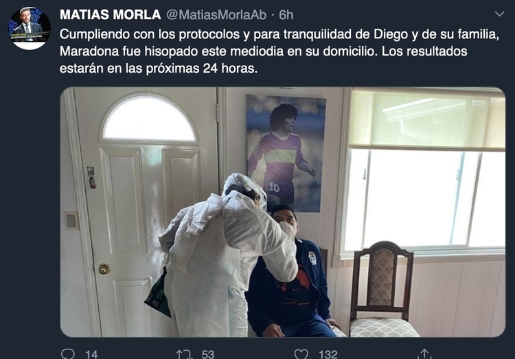 몰라는 "방역 당국의 지침에 따르고, 가족의 걱정을 덜기 위해 마라도나가 진단검사를 받았다"고 전했다.
